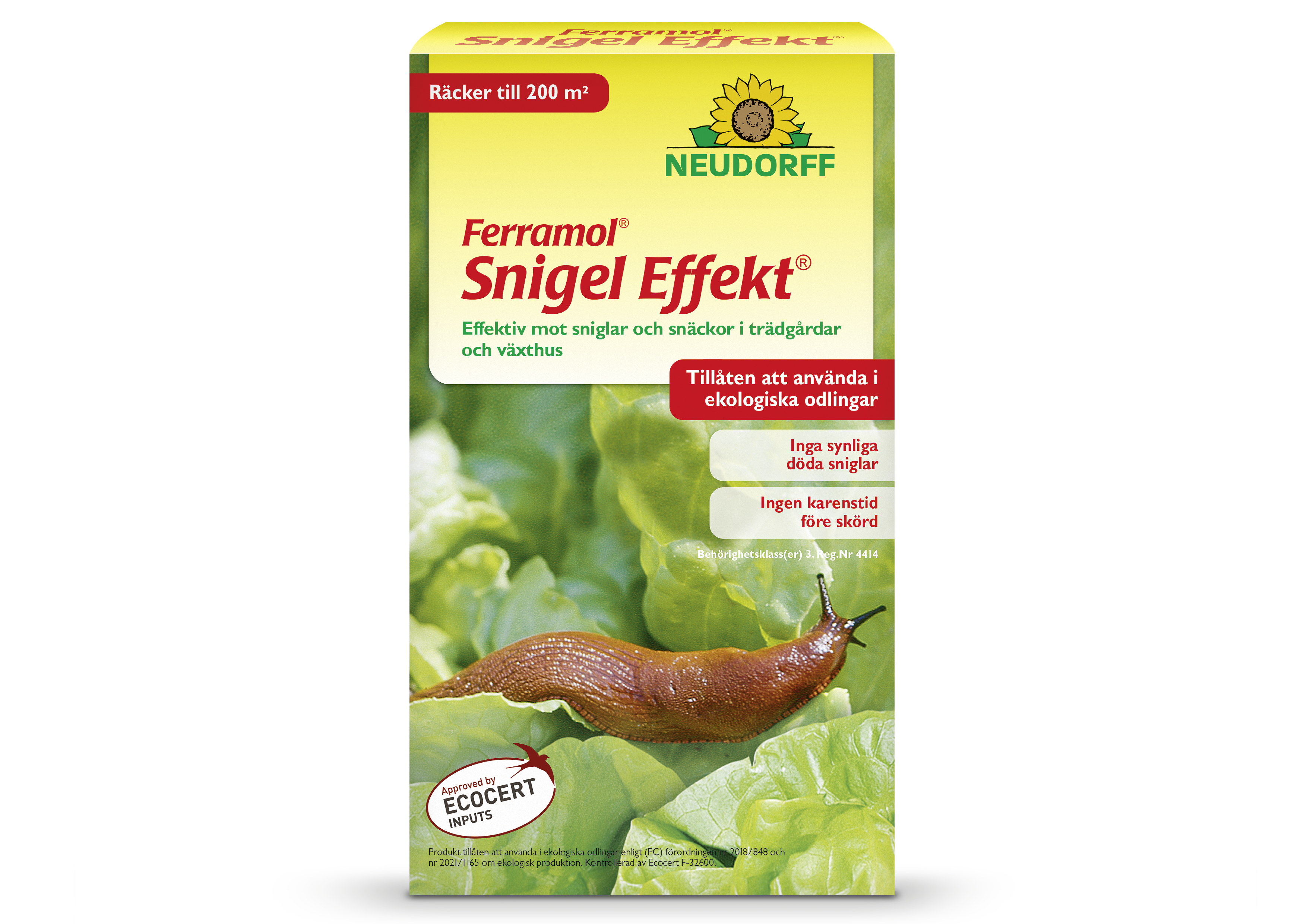 Sniglar kan orsaka en hel del skador på jordgubbar, salladsblad och andra växter i trädgården. Med Neudorffs Ferramol® Snigel Effekt+ bekämpas alla sniglar effektivt. Den aktiva ingrediensen, järnfosfat, är en naturligt förekommande järnförening utan skadliga kemikalier eller bekämpningsmedel. Medlet fungerar genom att locka sniglarna till pellets och när de ätit av dem slutar de att äta. De kryper sedan ner i marken eller till en avskild plats för att dö utan att lämna spår av slem och det finns inget behov av att samla in döda sniglar. Pelletsen står emot regn och sväller när de blir fuktiga, vilket gör dem ännu attraktivare för sniglar. Vårt snigelmedel är biologiskt nedbrytbart och de pellets som inte äts upp omvandlas till järn och fosfat som blir till näringsämnen för dina växter. Ingen karenstid behövs före skörd. Ferramol® Snigel Effekt+ är helt fritt från konserveringsmedel.