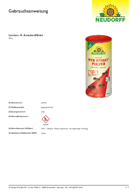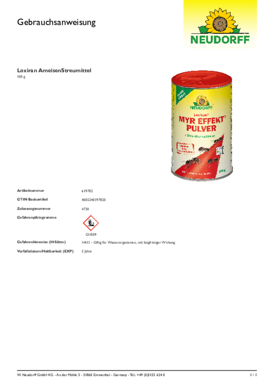 Vattna ut: Lös upp 40 g (1∕2 dl) Loxiran® Myr Effekt Pulver** i 1 ltr vatten. Vattna direkt på myrbon och gångstråk. Bäst effekt uppnås vid bevattning på morgon och kväll, då flest myror befinner sig i myrboet. Behandlat område kan beträdas när medlet har torkat in.